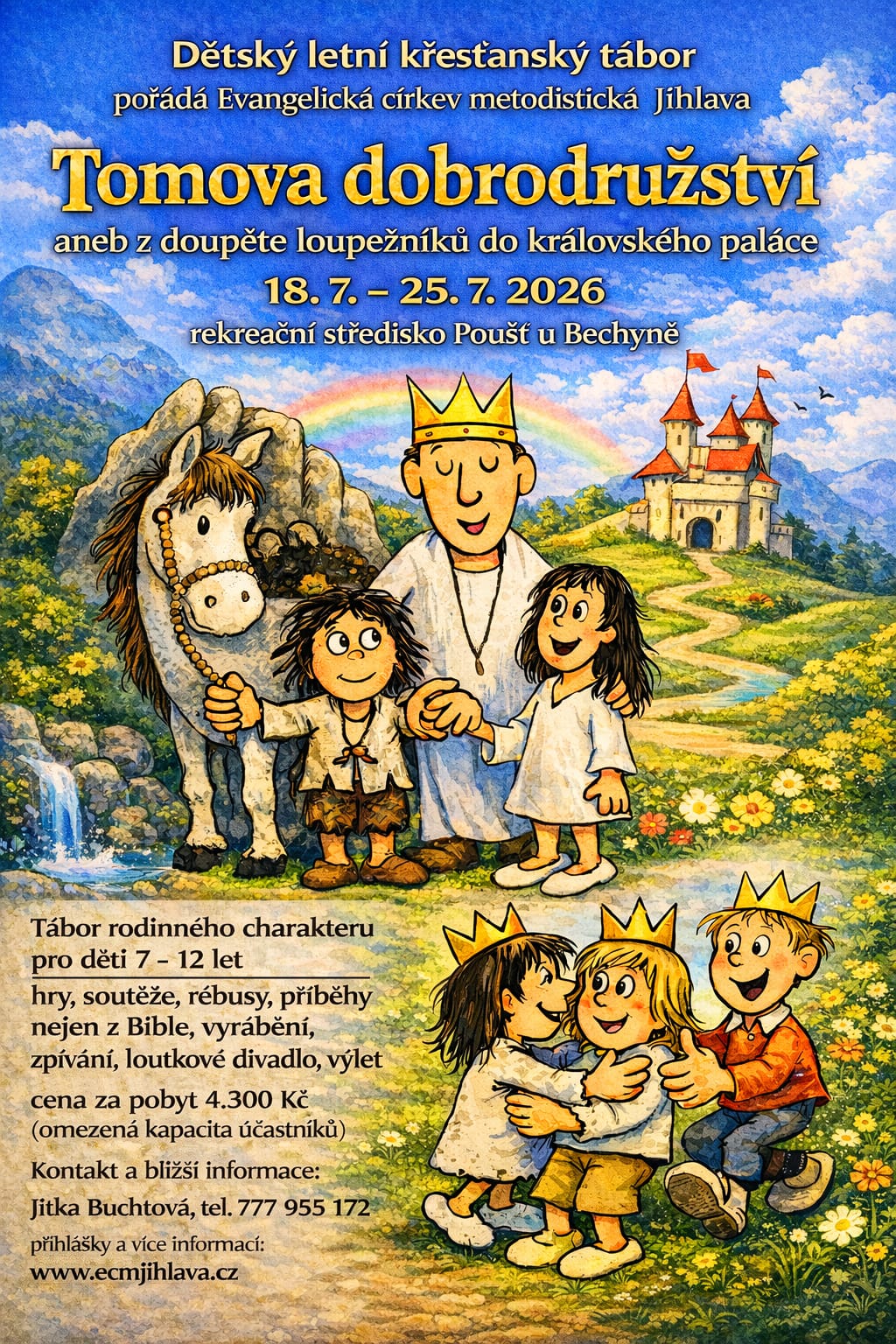 Tábor rodinného charakteru pro děti 7-12 let. Hry, soutěže, rébusy, příběhy nejen z Bible, vyrábění, zpívání, loutkové divadlo, výlet.